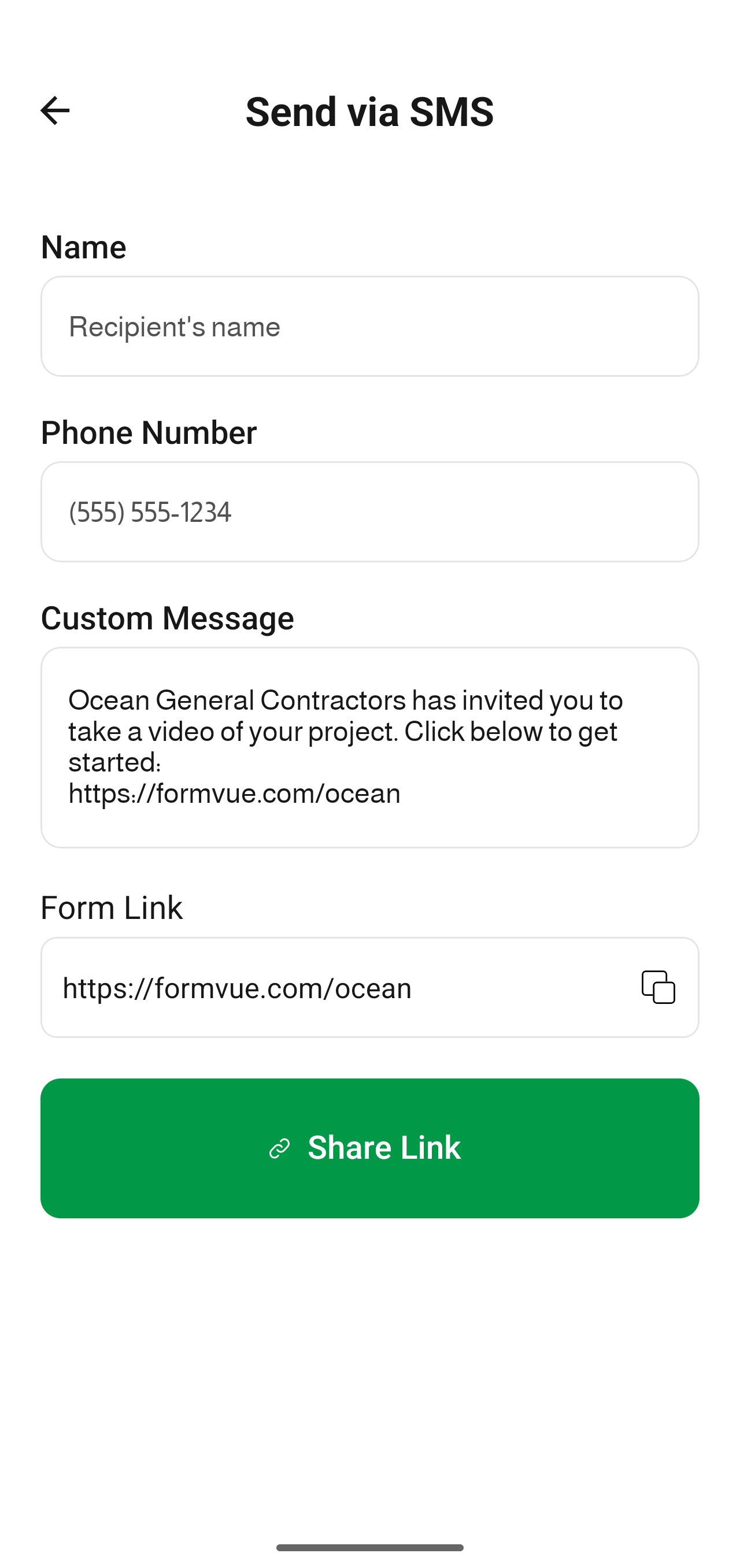FormVue Tip: If you don't enter a phone number, clicking Share Link at the bottom will open your phones sharing options. It is recommended to enter a phone number so the link can be tracked. - Optional: customize the message in the Custom Message area