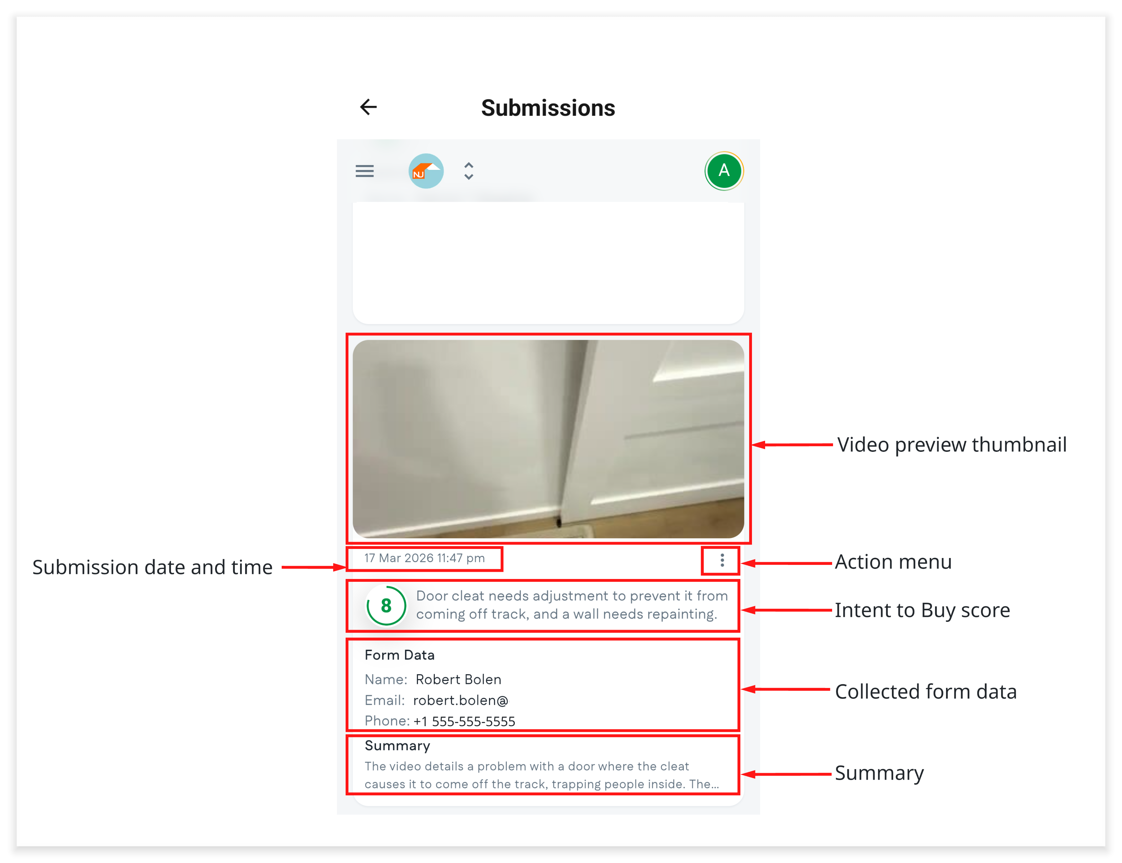 - Use the action menu button for quick access to contacting the customer or managing the submission