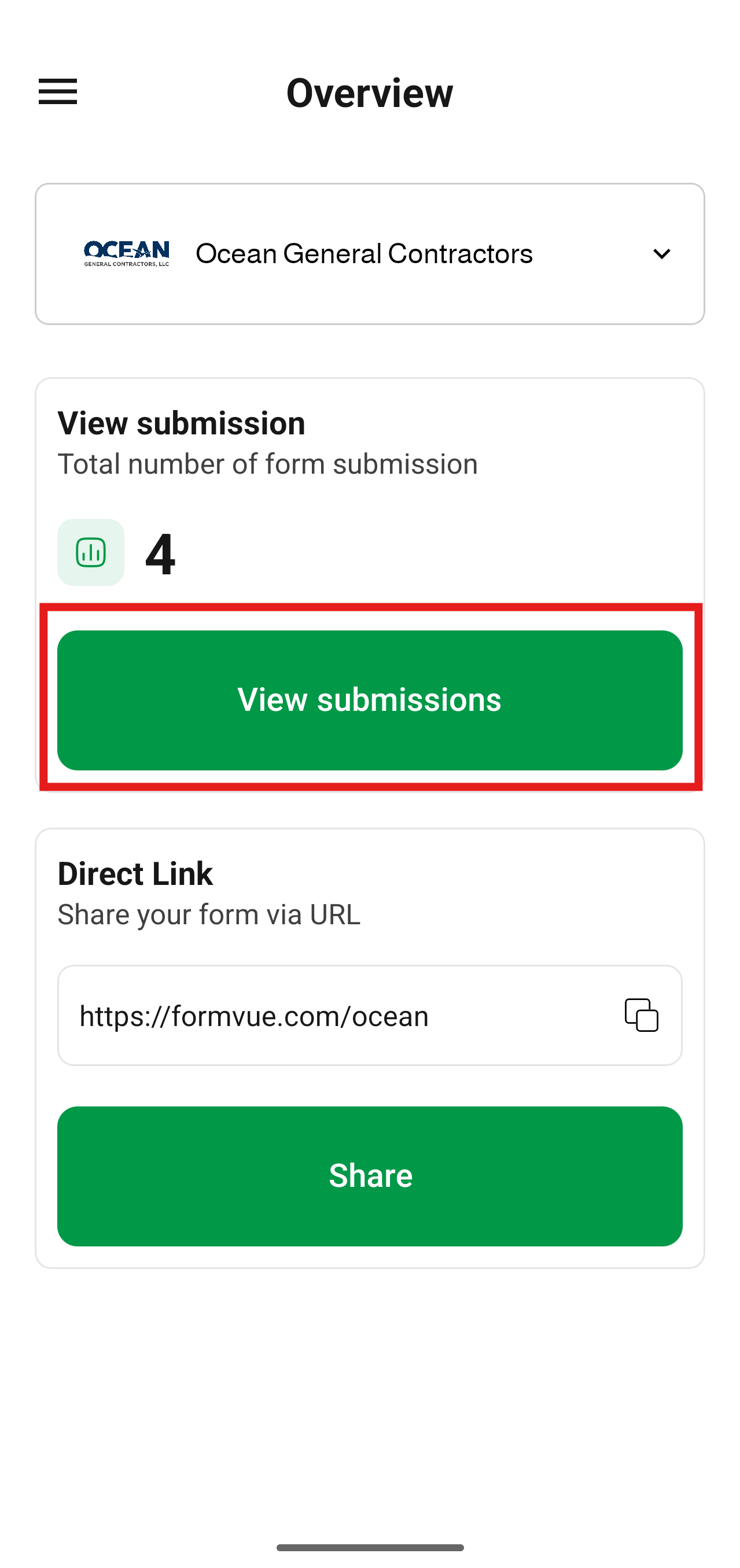 - From the Overview page of the mobile app, click View submissions to view your submissions.