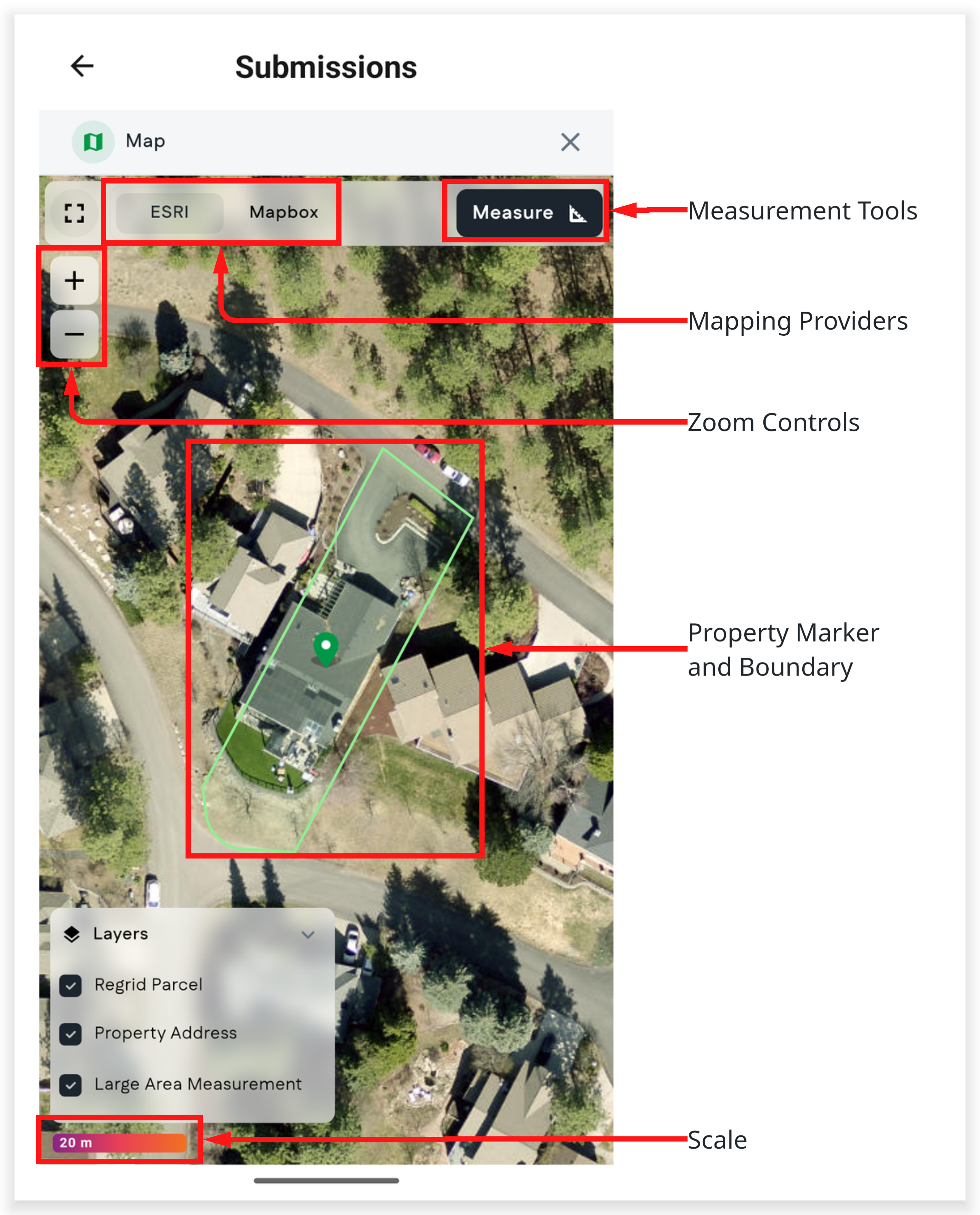 - Map: Provides a satellite map and several measuring tools for property visibility and estimating.
